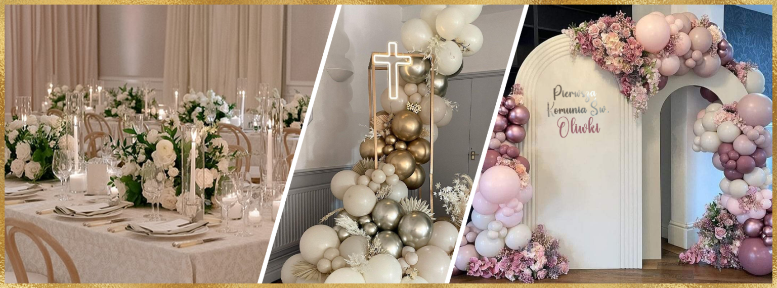 DEKORACJE NA PRZYJĘCIE Z OKAZJI PIERWSZEJ KOMUNII ŚWIĘTEJ – KWIATY NA STOŁY, ŚCIANKI DO ZDJĘĆ