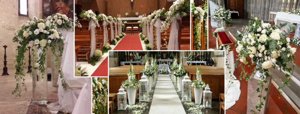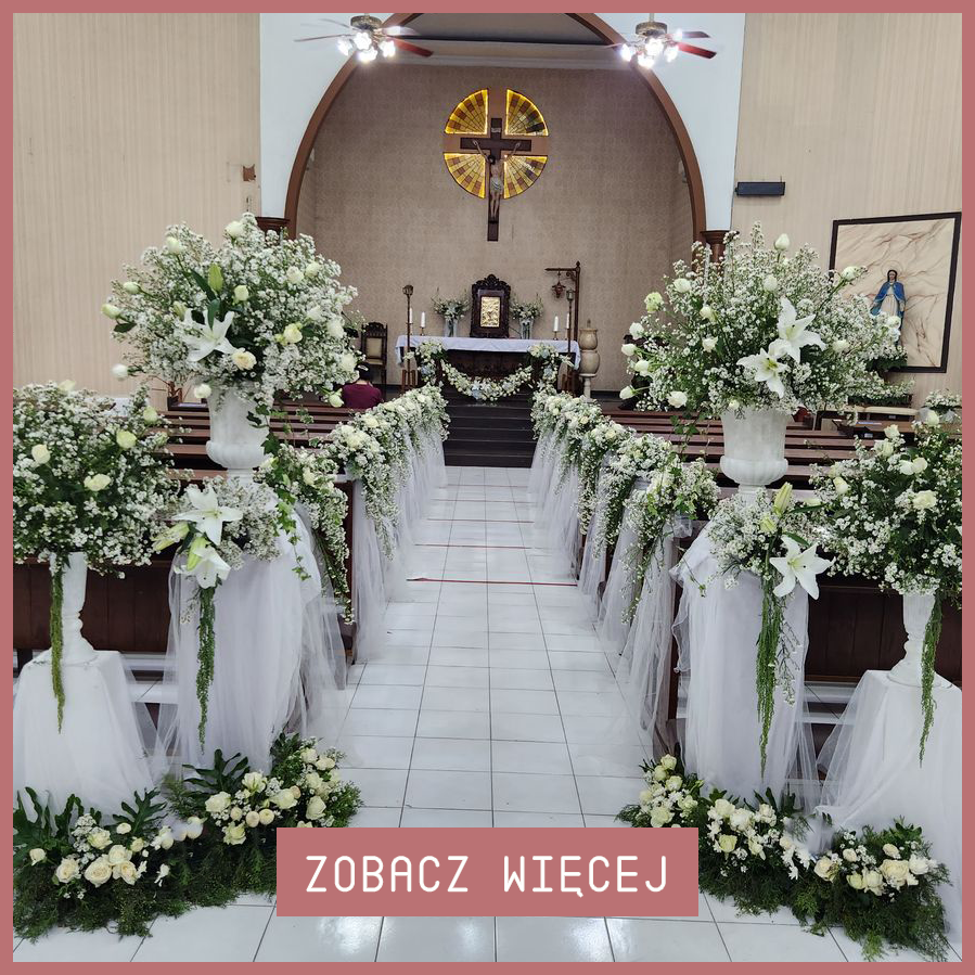 Kwiaty, świece, dywan, tabliczki z napisami, powitanie gości, woale, świeczniki, oświetlenie led, krzesła, dekoracja klęcznika, kolor. Duże kwietniki i małe dodatki, które jak przyprawa dodadzą smaku całości.