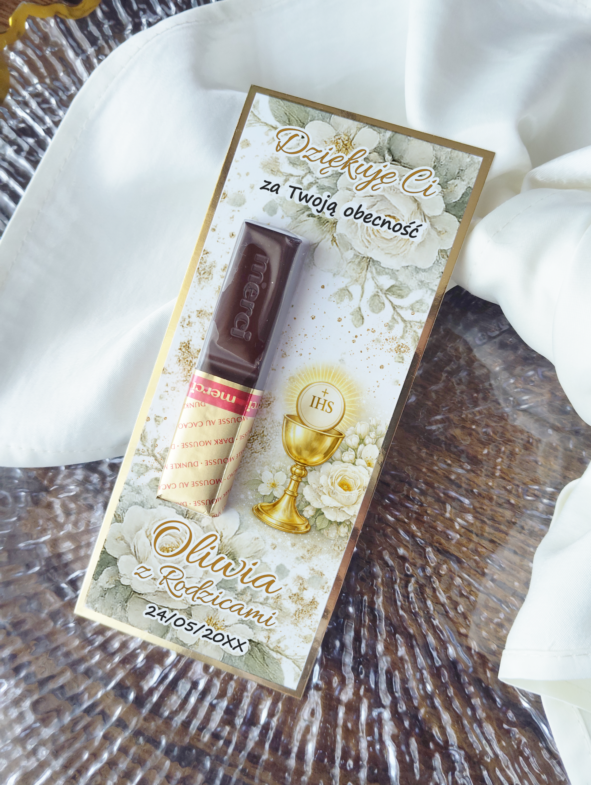 Delikatna karta z komunijną grafiką została połączona z czekoladką Merci – symbolem wdzięczności i serdecznego podziękowania. Całość tworzy estetyczne podziękowanie komunijne dla gości, które doskonale prezentuje się na stole podczas przyjęcia.