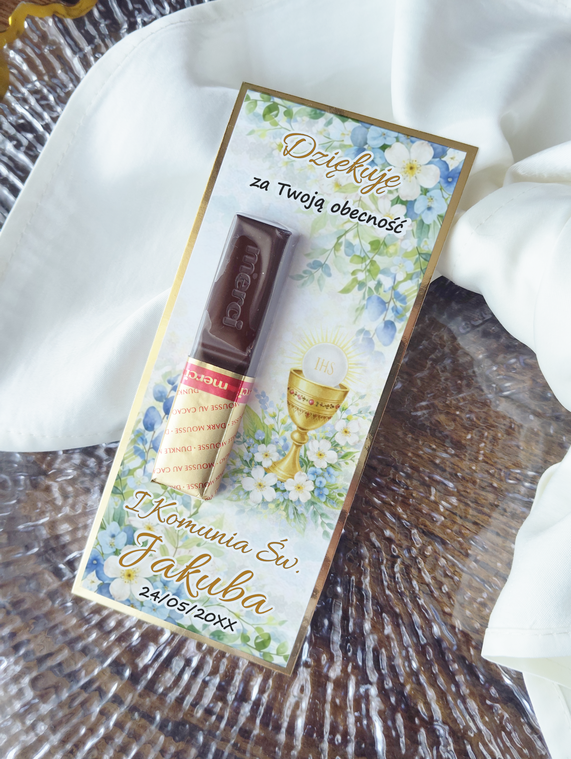 Podziękowania komunijne z czekoladką Merci