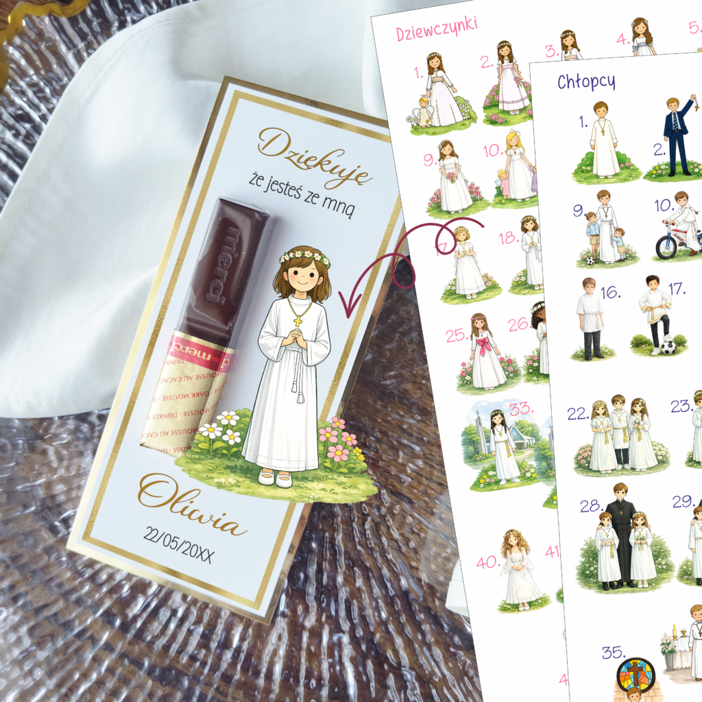 Taki drobny upominek jest nie tylko miłym gestem, ale także eleganckim elementem dekoracji stołu komunijnego. Podziękowania można ułożyć przy nakryciu każdego gościa lub wręczyć na zakończenie przyjęcia jako pamiątkę tego ważnego dnia.