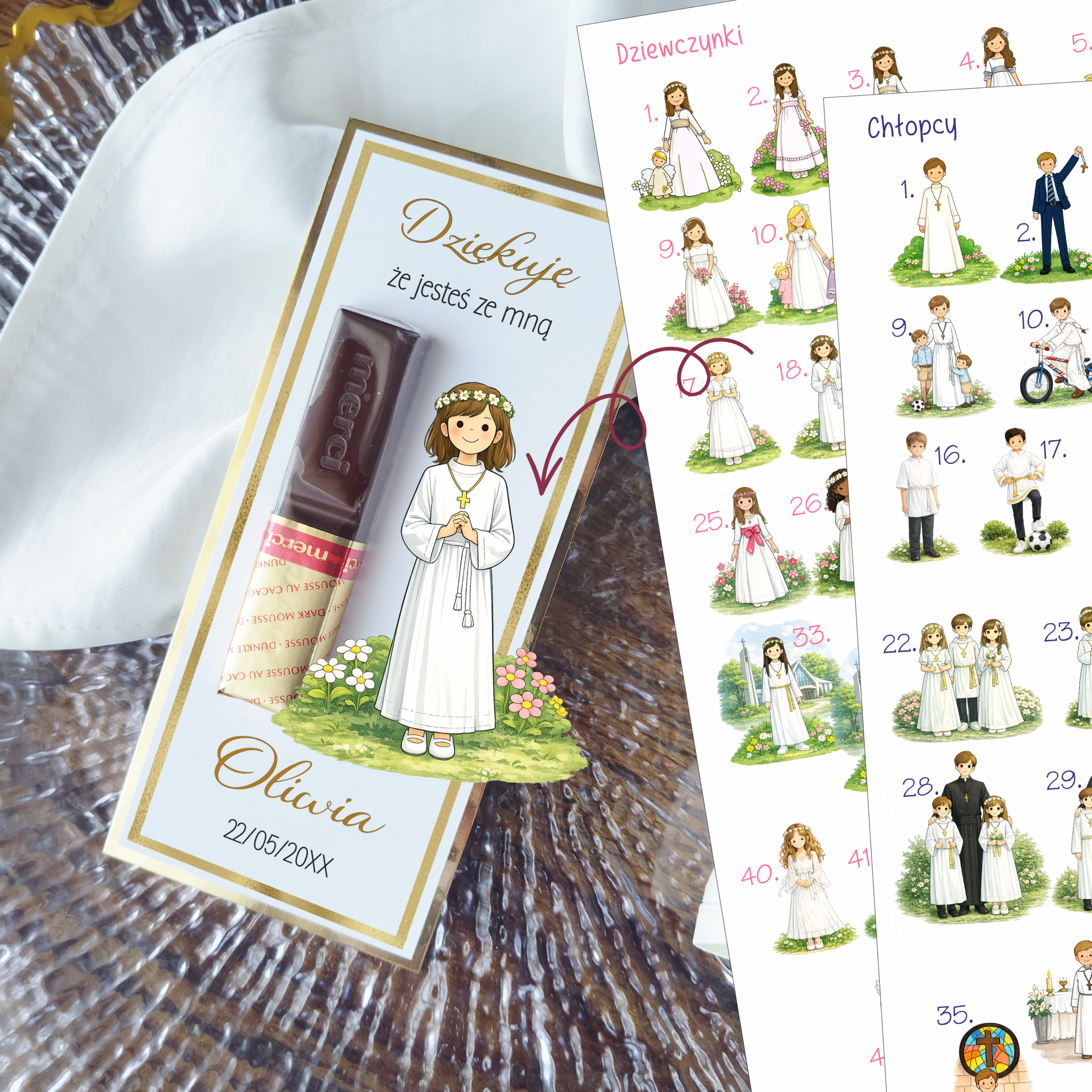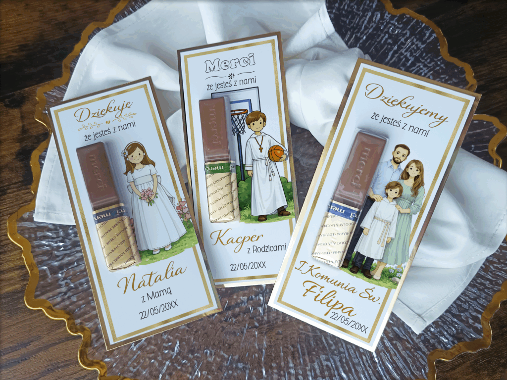 Podziękowania komunijne z czekoladką Merci