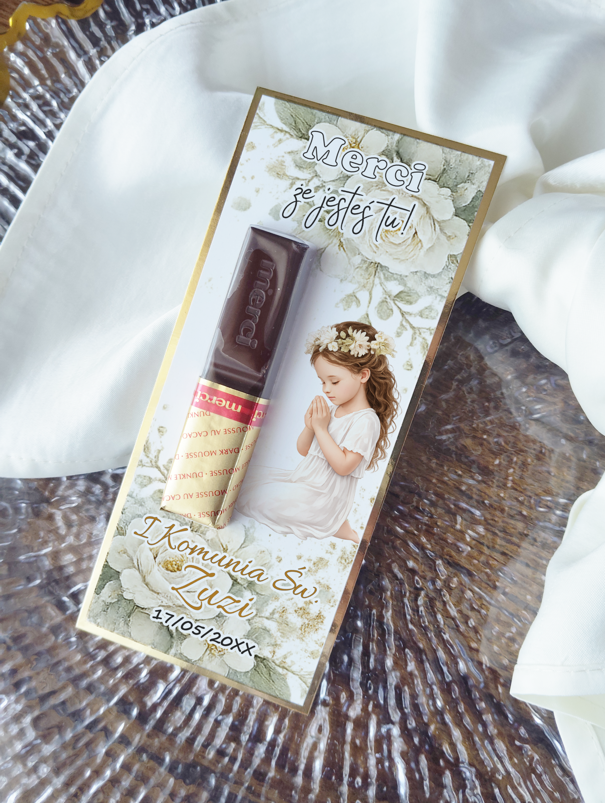 Podziękowania komunijne z czekoladką Merci