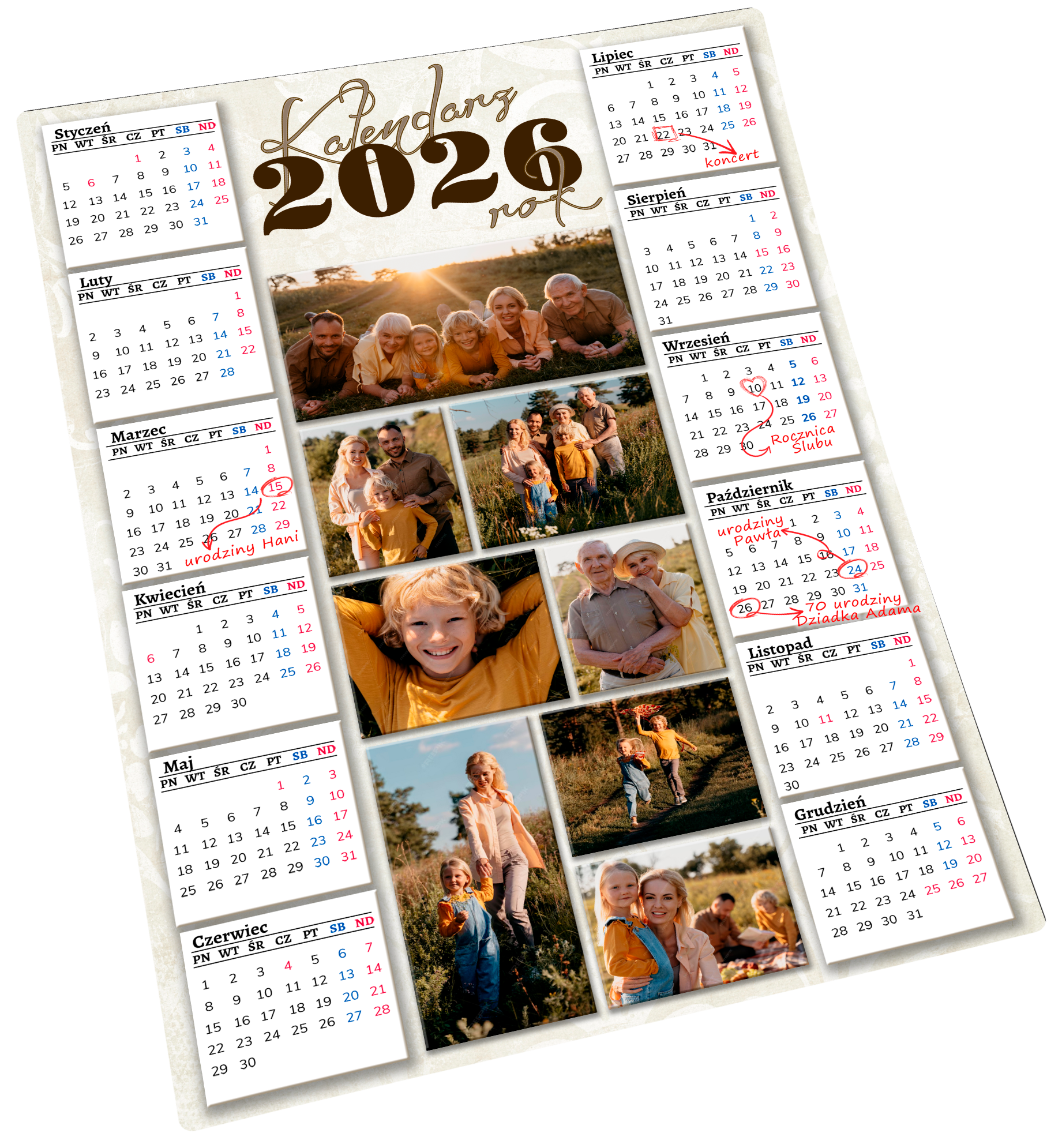 Wyjątkowy kalendarz wypełniony Waszymi ulubionymi zdjęciami – pełen rodzinnego ciepła, naturalnych emocji i pięknych wspomnień zapisanych w kadrach. Jasne, słoneczne fotografie wprowadzają do wnętrza pogodną, przytulną atmosferę, czyniąc z kalendarza nie tylko praktyczny dodatek, ale i osobistą dekorację o dużej wartości sentymentalnej.