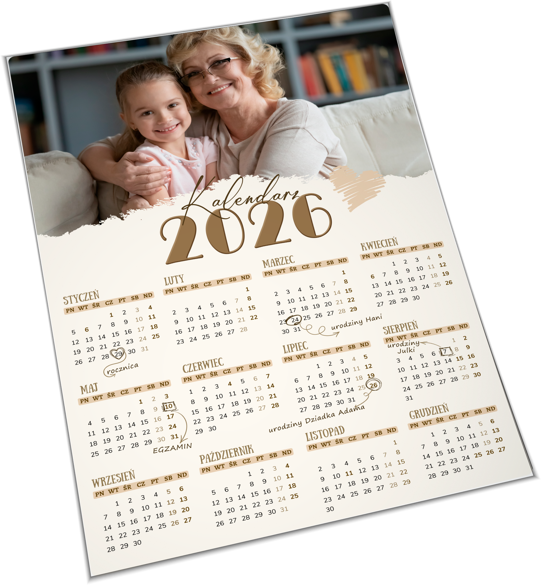 Kalendarz pełen bliskości i rodzinnego ciepła – subtelna, jasna kompozycja z dużym zdjęciem sprawia, że każdy miesiąc nabiera wyjątkowego znaczenia. Delikatna paleta barw, klasyczna typografia i spokojny układ tworzą harmonijną dekorację, która wprowadza do wnętrza atmosferę domowego spokoju i wdzięczności za wspólne chwile.