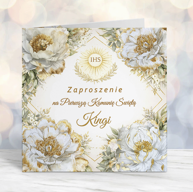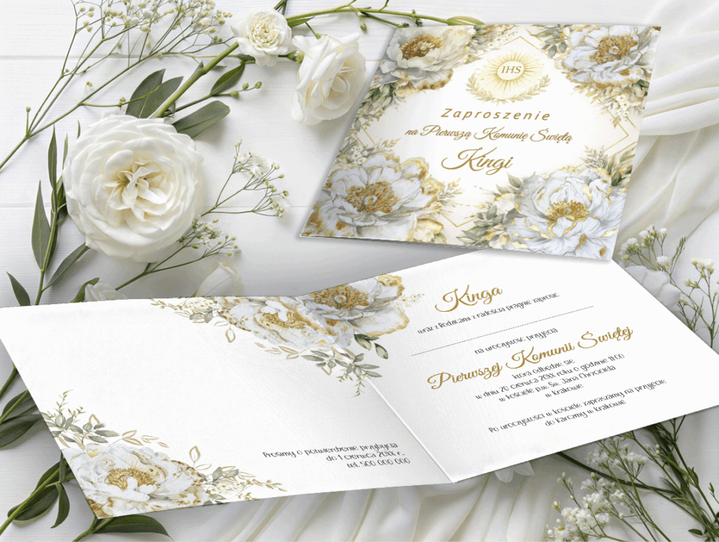 Eleganckie zaproszenie komunijne, idealne na uroczystość Pierwszej Komunii Świętej. Składana forma, wysoka jakość papieru i pełna personalizacja sprawiają, że zaproszenie pięknie podkreśla wyjątkowy charakter tego dnia.