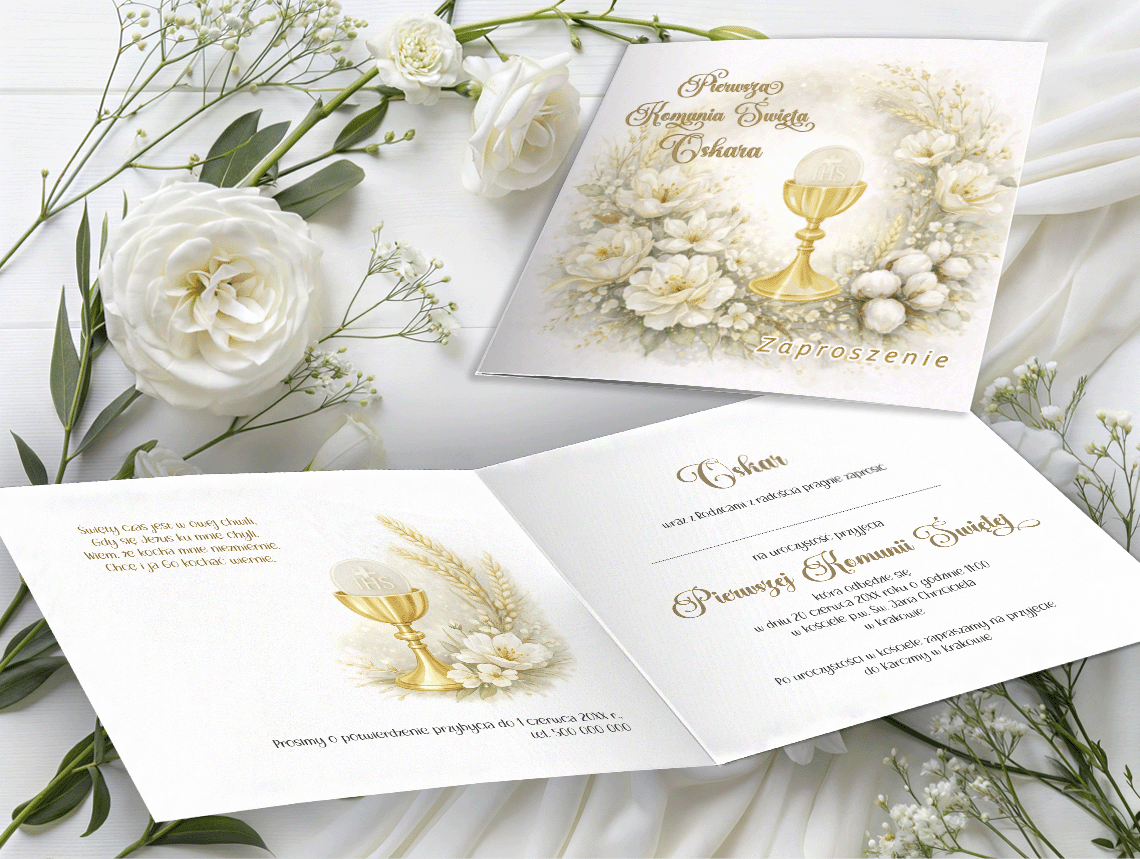 Eleganckie zaproszenie komunijne, idealne na uroczystość Pierwszej Komunii Świętej. Składana forma, wysoka jakość papieru i pełna personalizacja sprawiają, że zaproszenie pięknie podkreśla wyjątkowy charakter tego dnia.