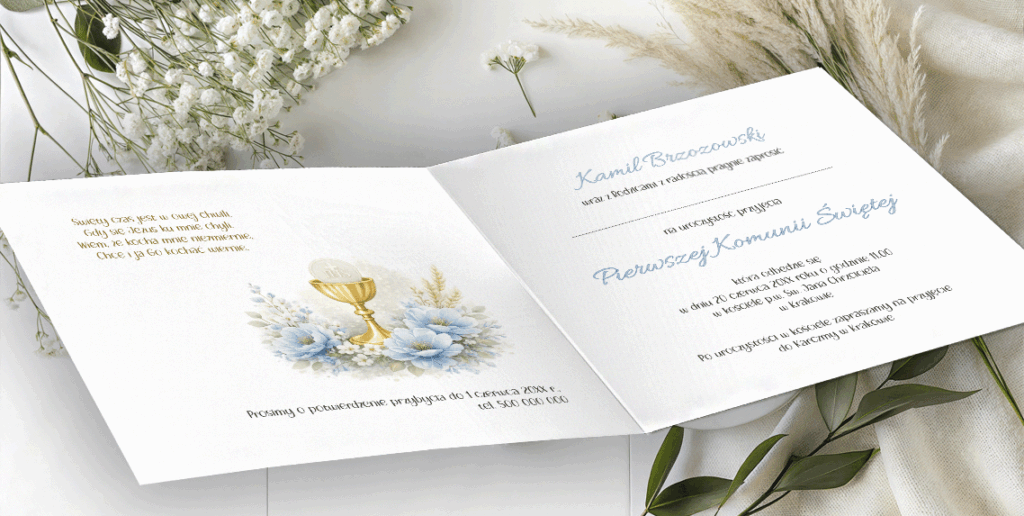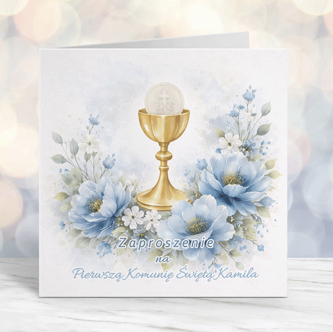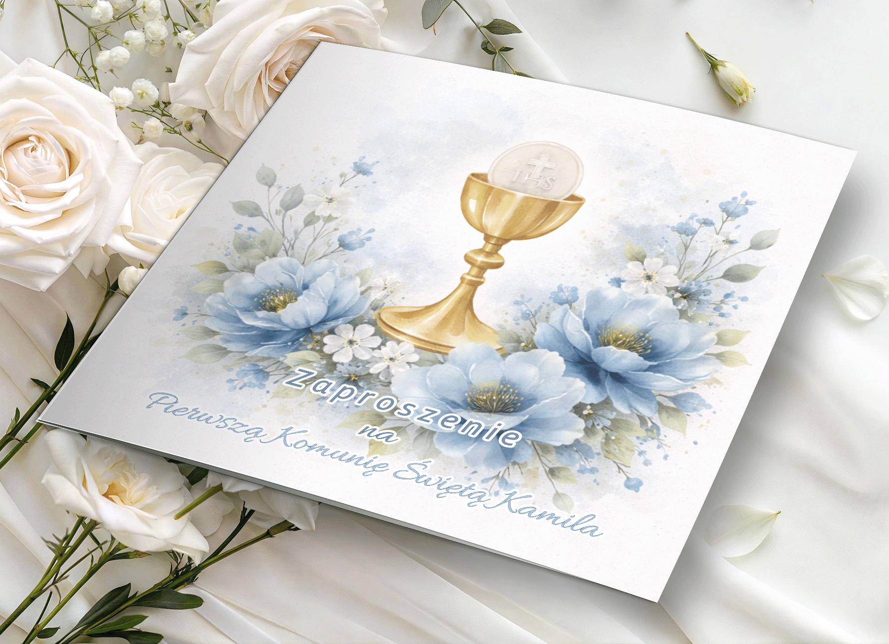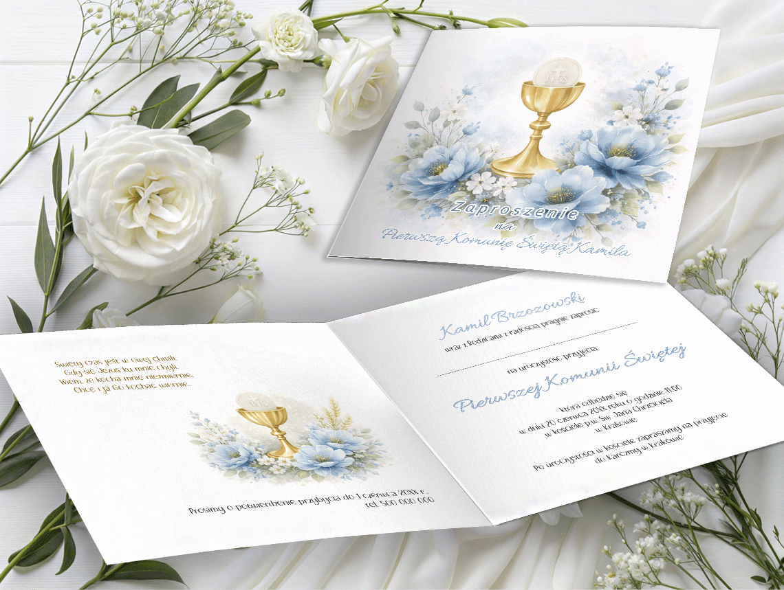 Eleganckie zaproszenie komunijne, idealne na uroczystość Pierwszej Komunii Świętej. Składana forma, wysoka jakość papieru i pełna personalizacja sprawiają, że zaproszenie pięknie podkreśla wyjątkowy charakter tego dnia.