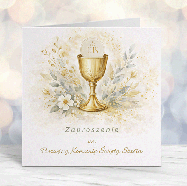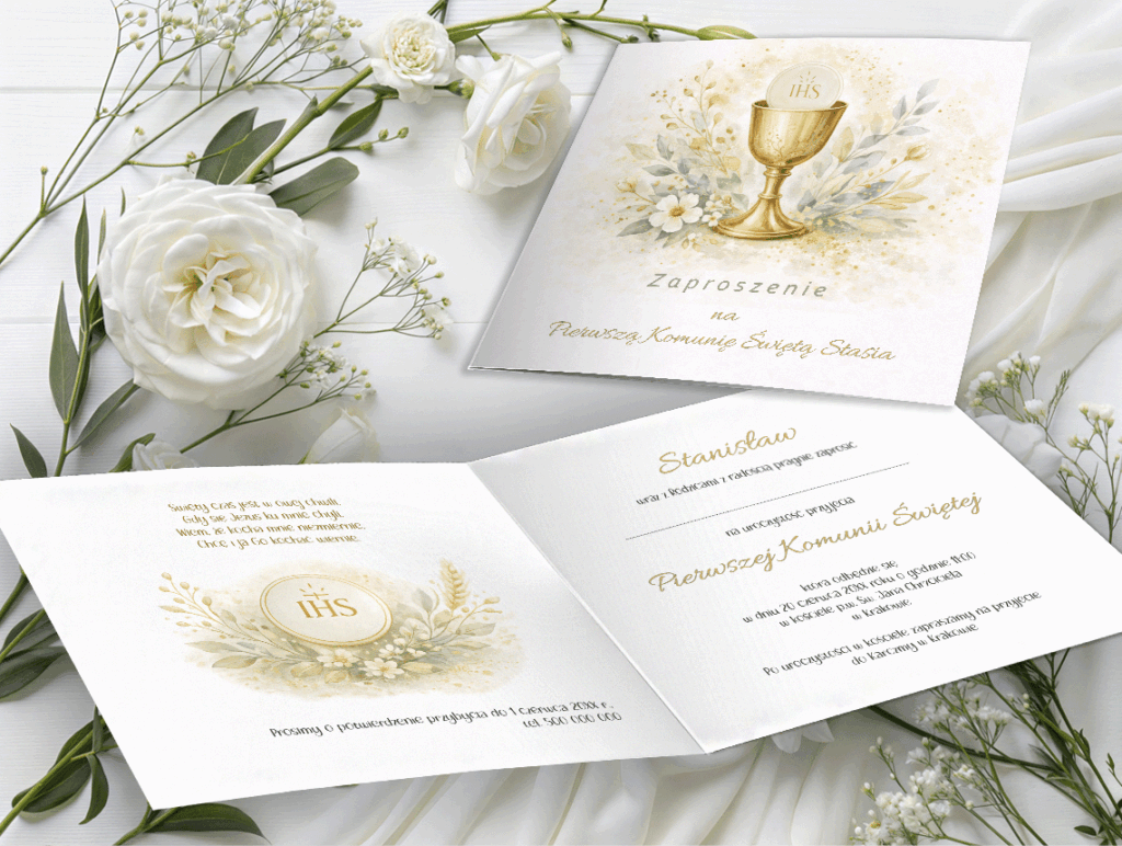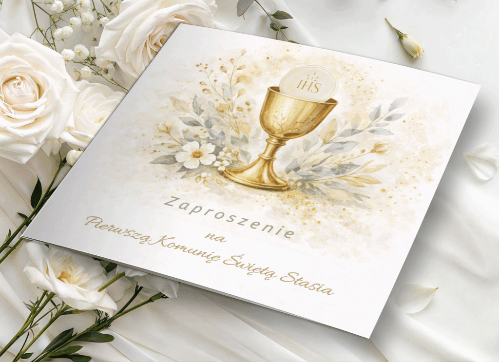 Eleganckie zaproszenie komunijne, idealne na uroczystość Pierwszej Komunii Świętej. Składana forma, wysoka jakość papieru i pełna personalizacja sprawiają, że zaproszenie pięknie podkreśla wyjątkowy charakter tego dnia.