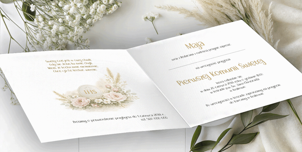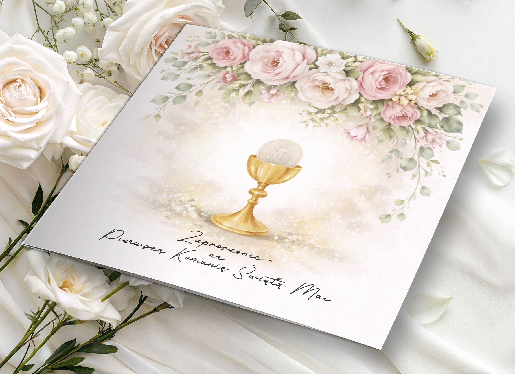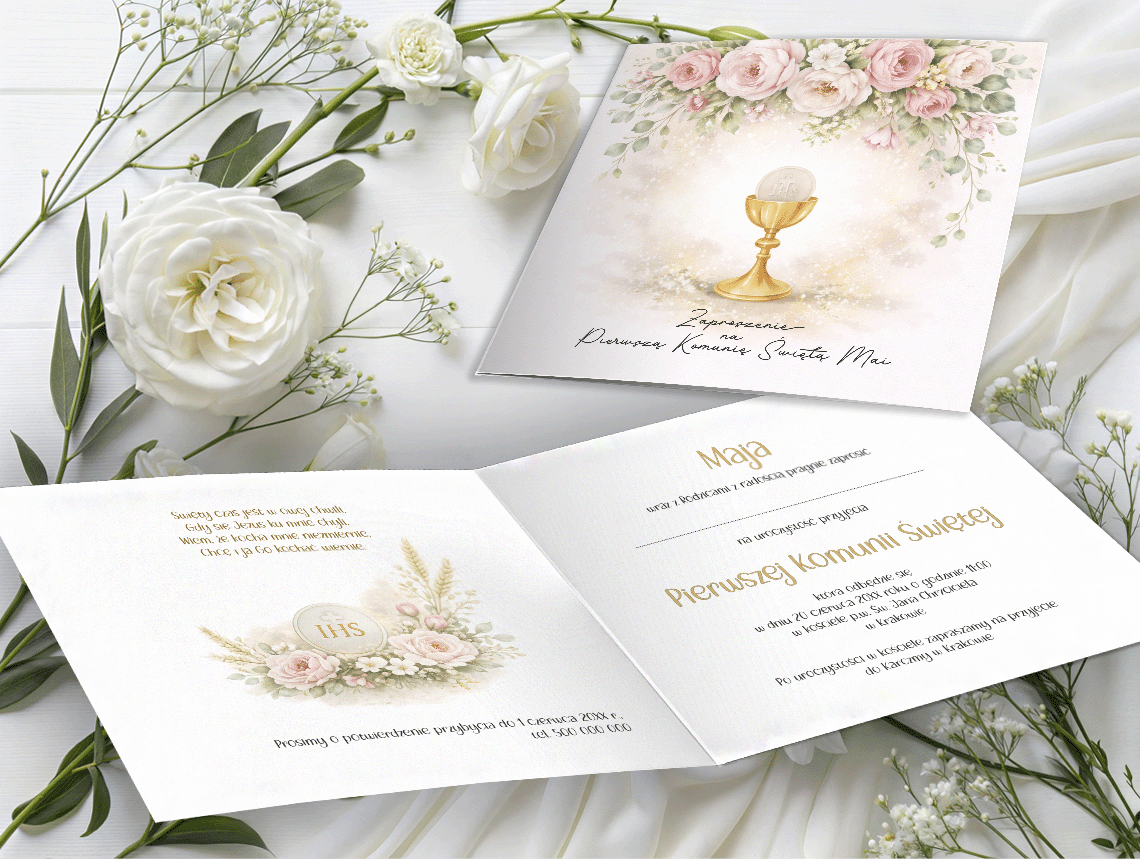 Eleganckie zaproszenie komunijne, idealne na uroczystość Pierwszej Komunii Świętej. Składana forma, wysoka jakość papieru i pełna personalizacja sprawiają, że zaproszenie pięknie podkreśla wyjątkowy charakter tego dnia.