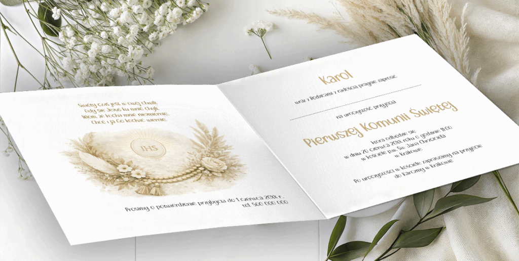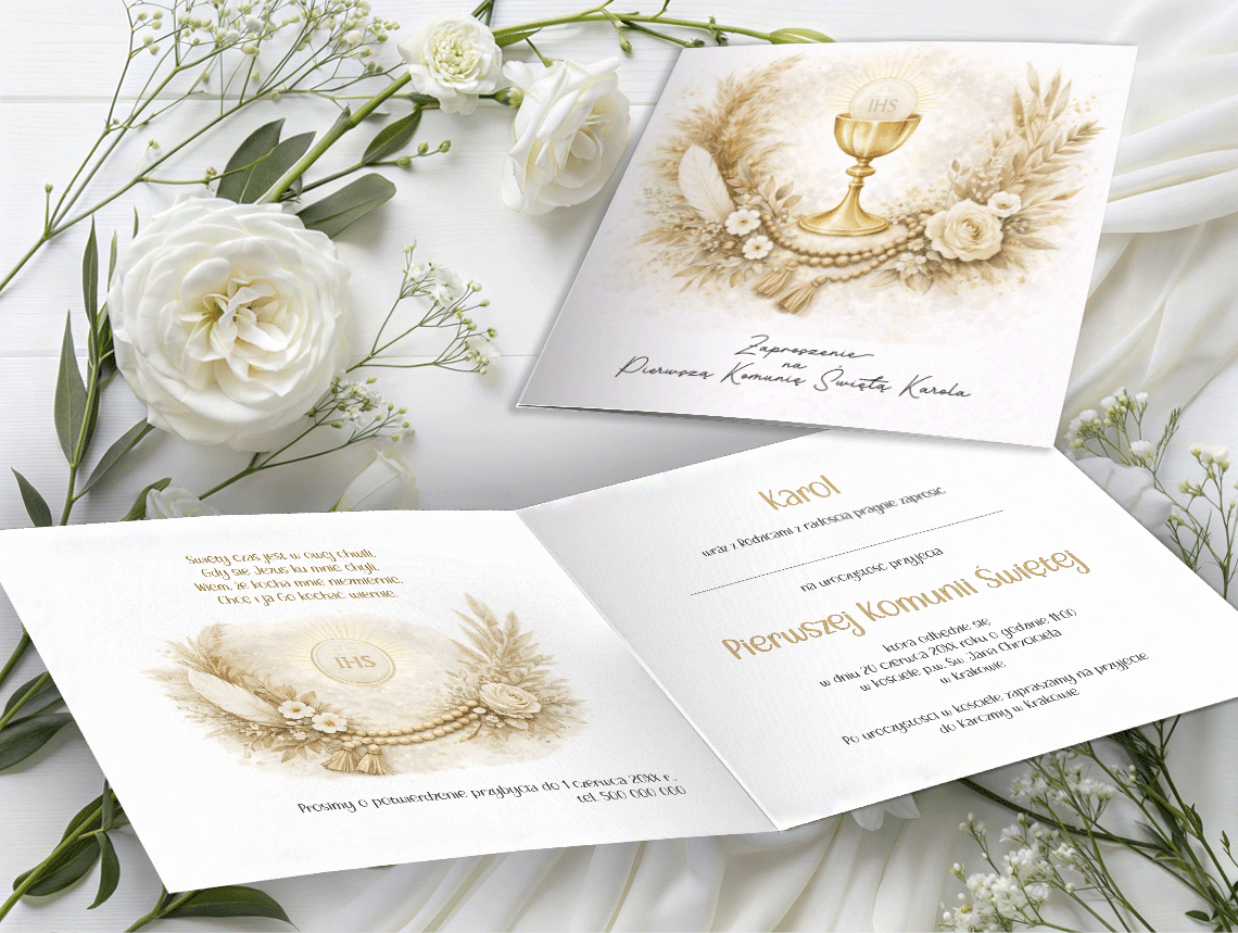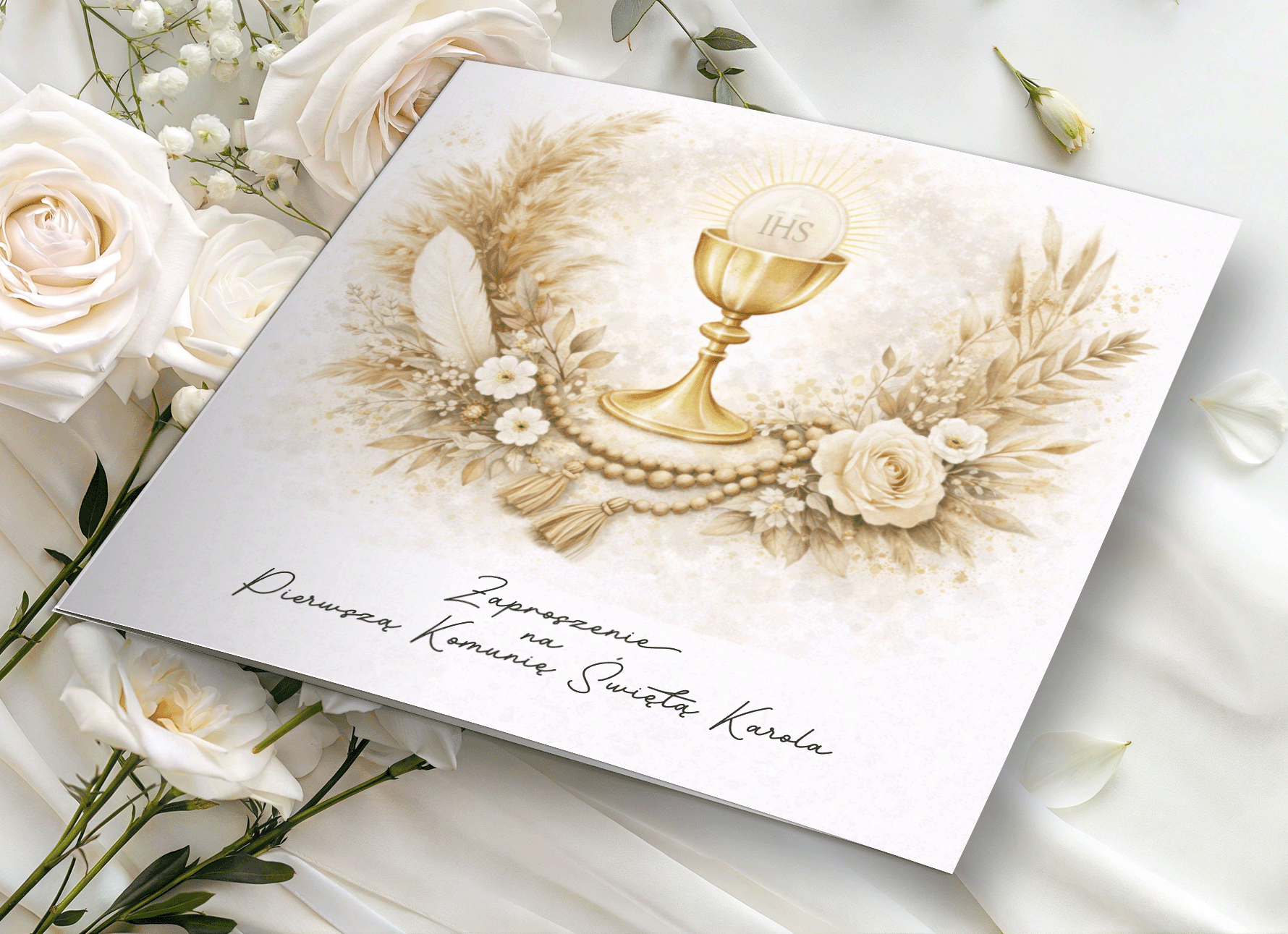 Eleganckie zaproszenie komunijne, idealne na uroczystość Pierwszej Komunii Świętej. Składana forma, wysoka jakość papieru i pełna personalizacja sprawiają, że zaproszenie pięknie podkreśla wyjątkowy charakter tego dnia.