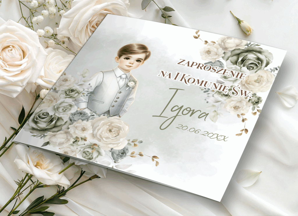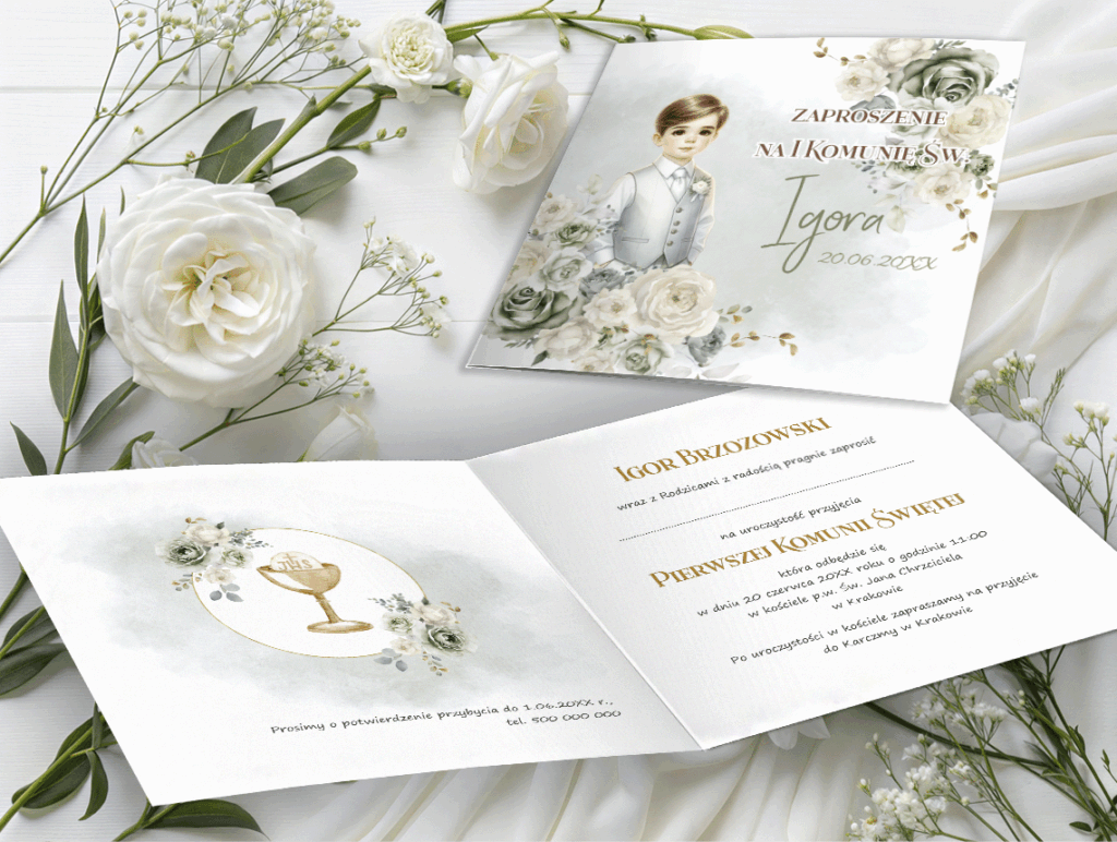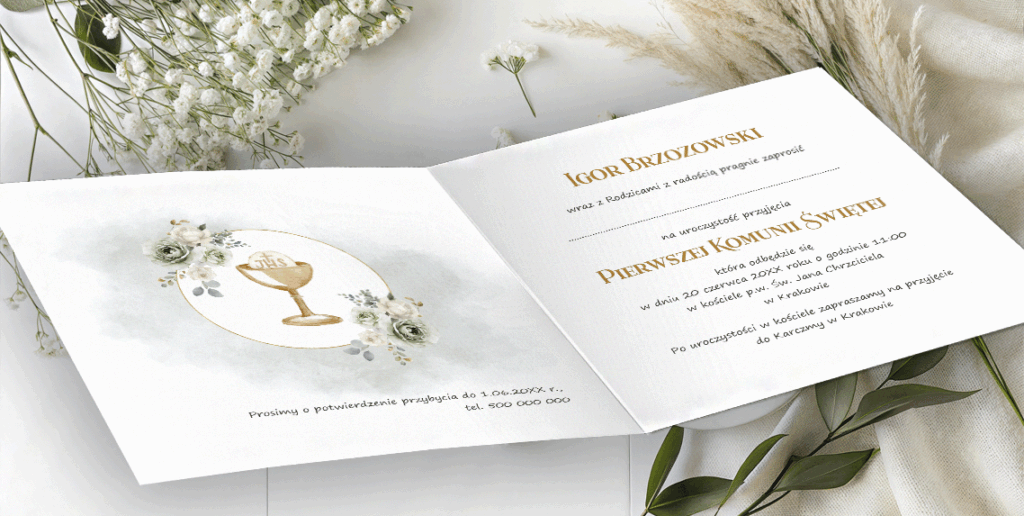 Eleganckie zaproszenie komunijne, idealne na uroczystość Pierwszej Komunii Świętej. Składana forma, wysoka jakość papieru i pełna personalizacja sprawiają, że zaproszenie pięknie podkreśla wyjątkowy charakter tego dnia.