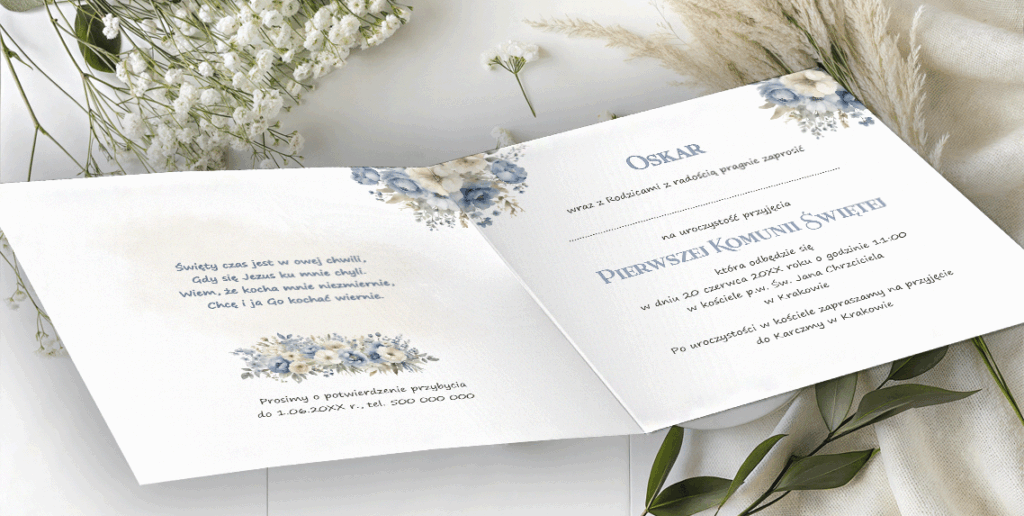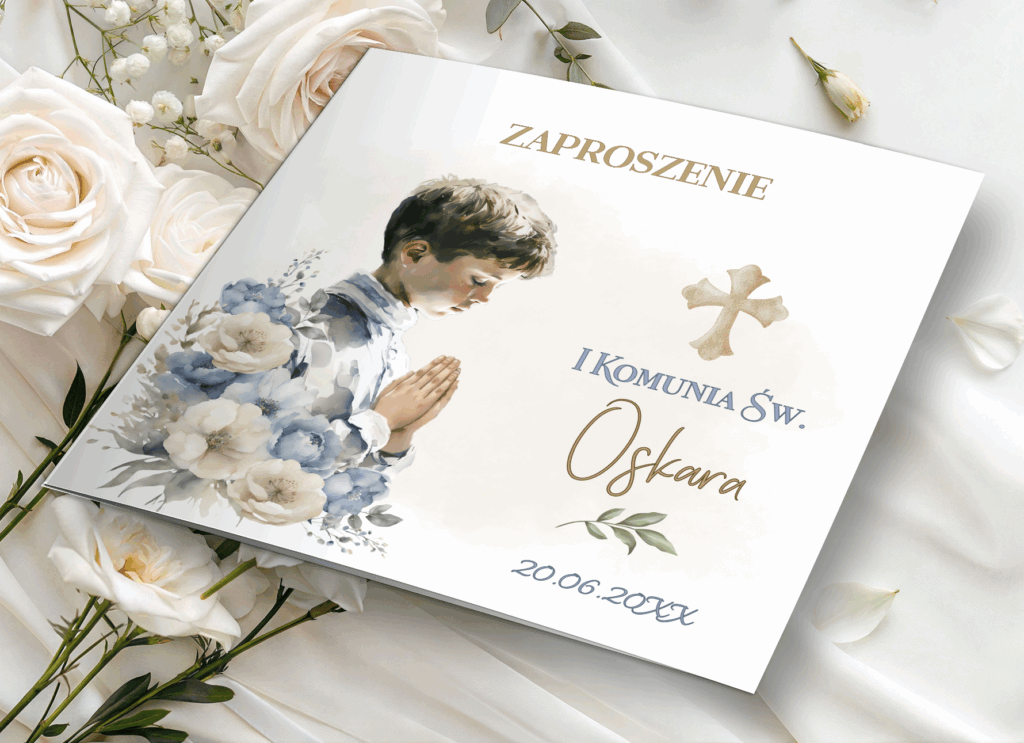 Eleganckie zaproszenie komunijne, idealne na uroczystość Pierwszej Komunii Świętej. Składana forma, wysoka jakość papieru i pełna personalizacja sprawiają, że zaproszenie pięknie podkreśla wyjątkowy charakter tego dnia.