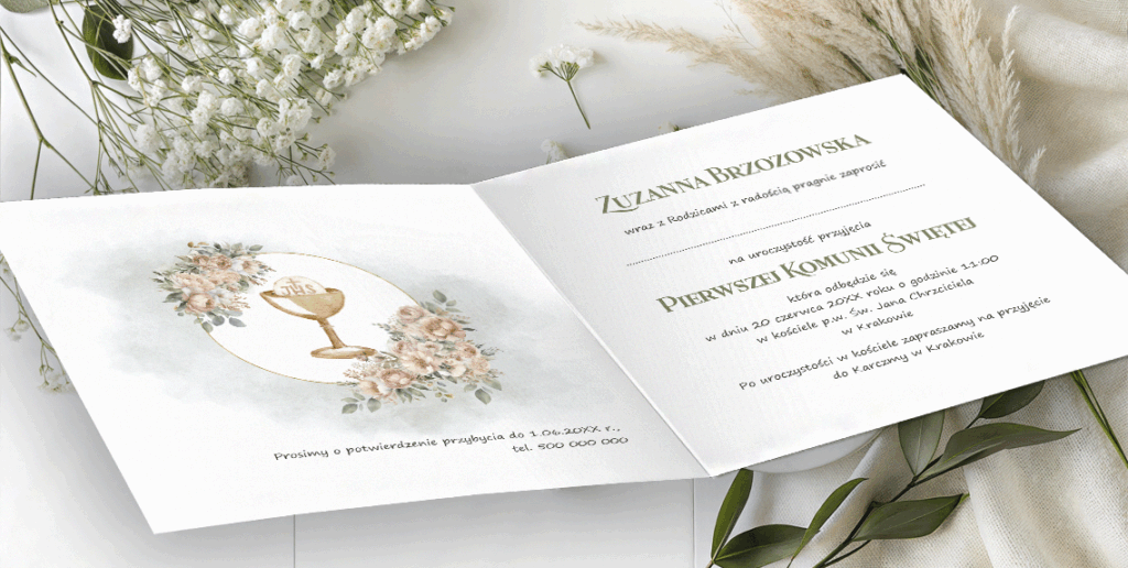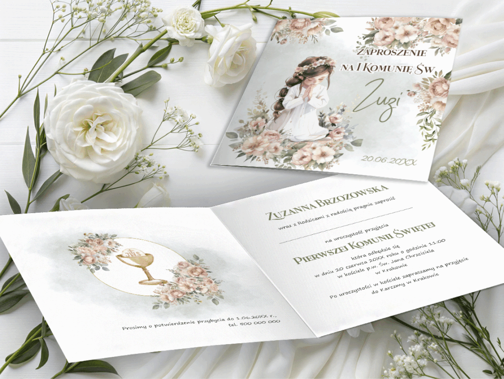 Eleganckie zaproszenie komunijne, idealne na uroczystość Pierwszej Komunii Świętej. Składana forma, wysoka jakość papieru i pełna personalizacja sprawiają, że zaproszenie pięknie podkreśla wyjątkowy charakter tego dnia.