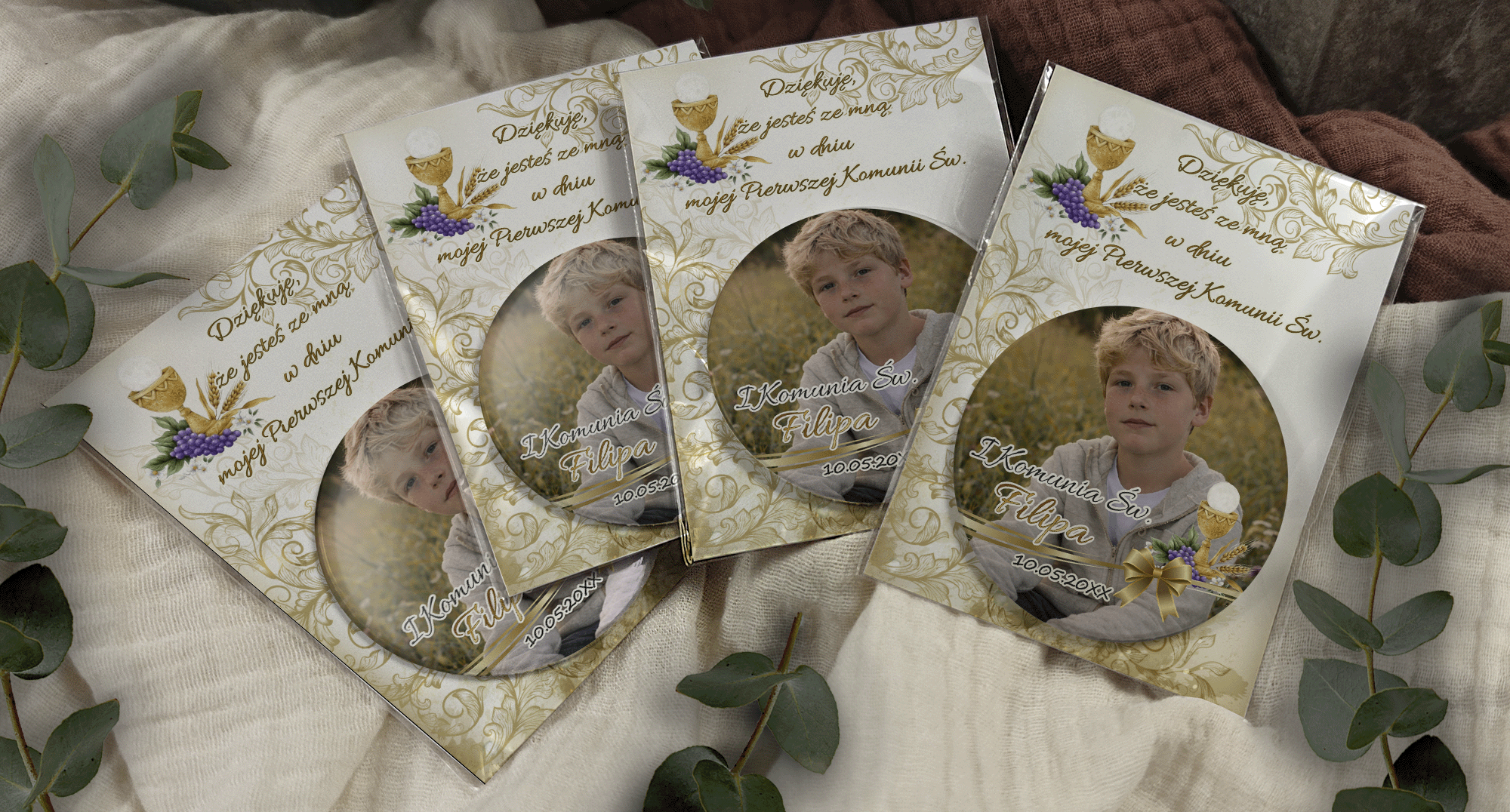 Personalizowany magnes ze zdjęciem dziecka to eleganckie podziękowanie dla gości Pierwszej Komunii Świętej. Subtelna pamiątka z imieniem i datą, dostępna w wersji z ozdobnym opakowaniem lub bez.