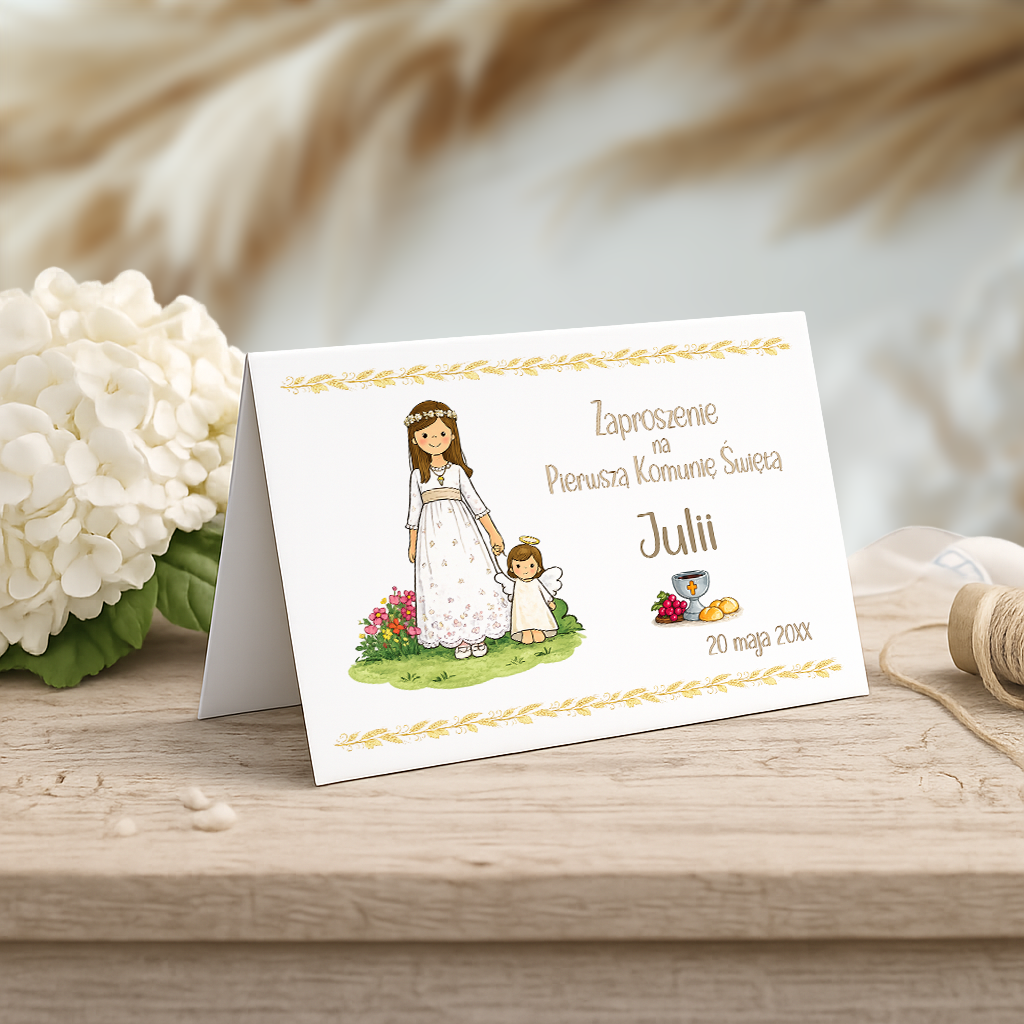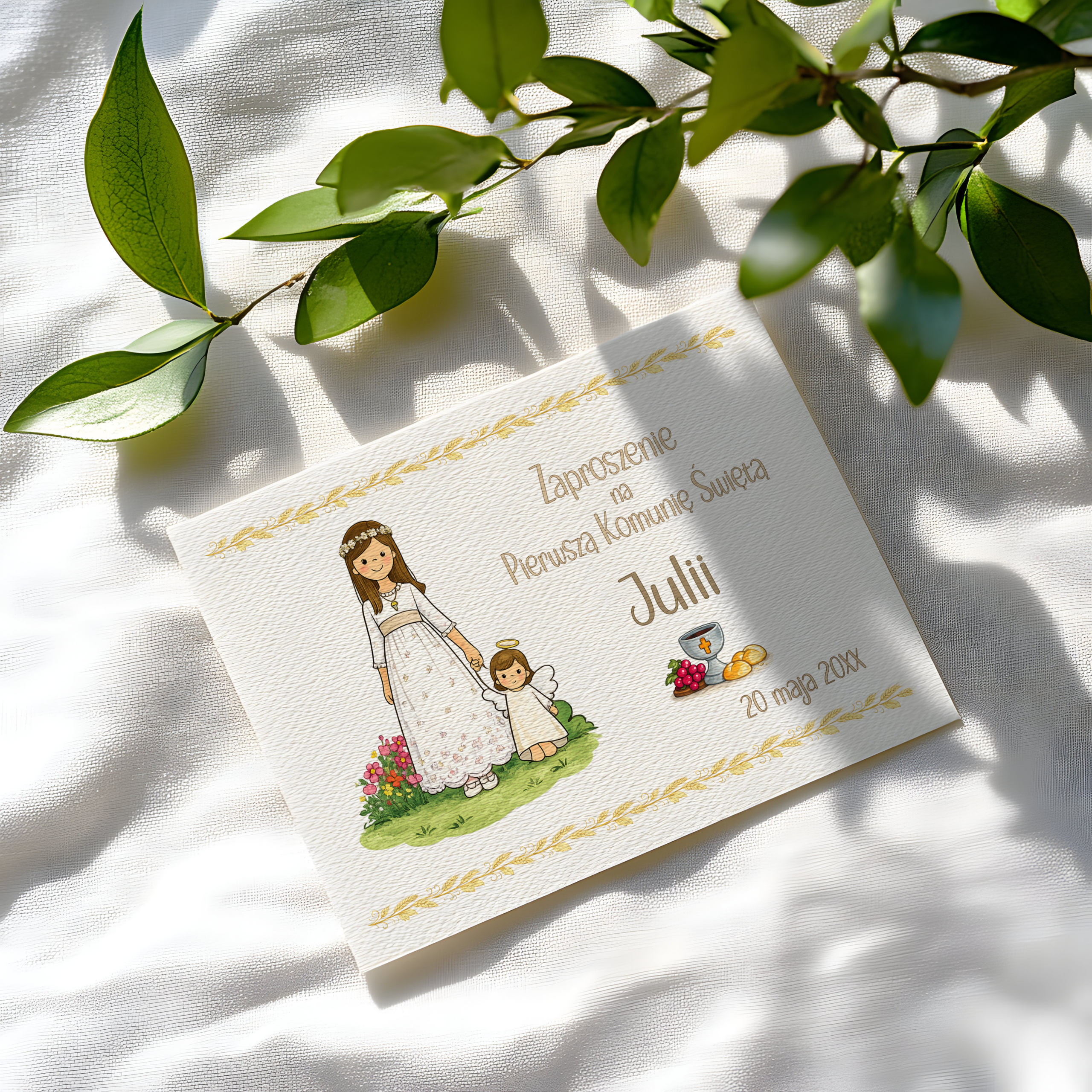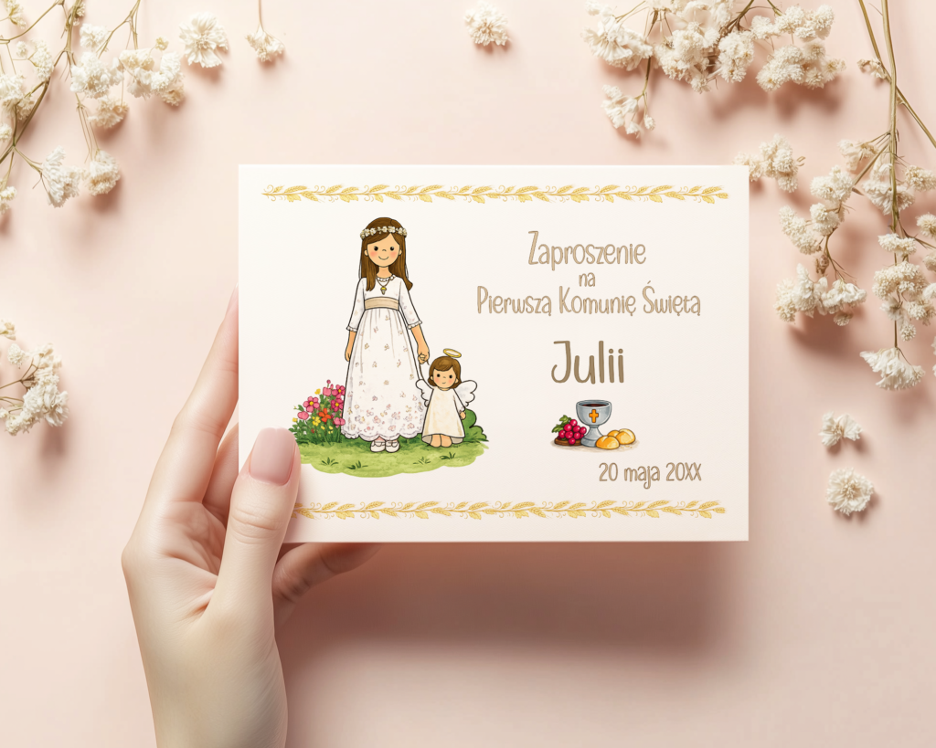 Delikatne zaproszenie na Pierwszą Komunię Świętą z personalizacją. Subtelny, ponadczasowy projekt idealny na wyjątkową uroczystość.