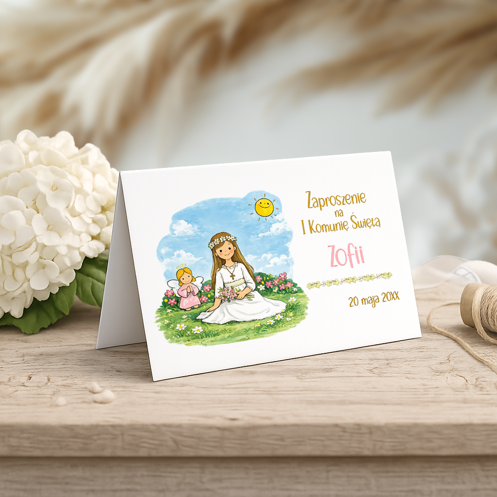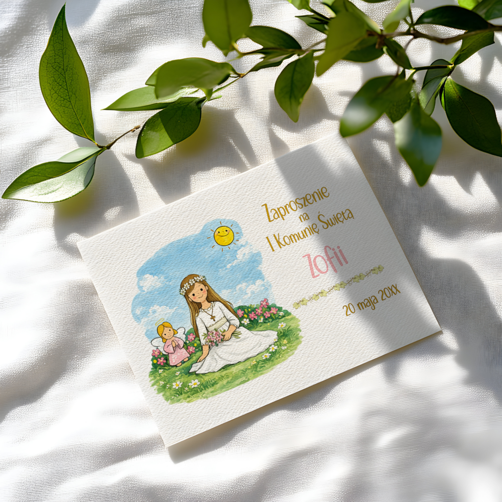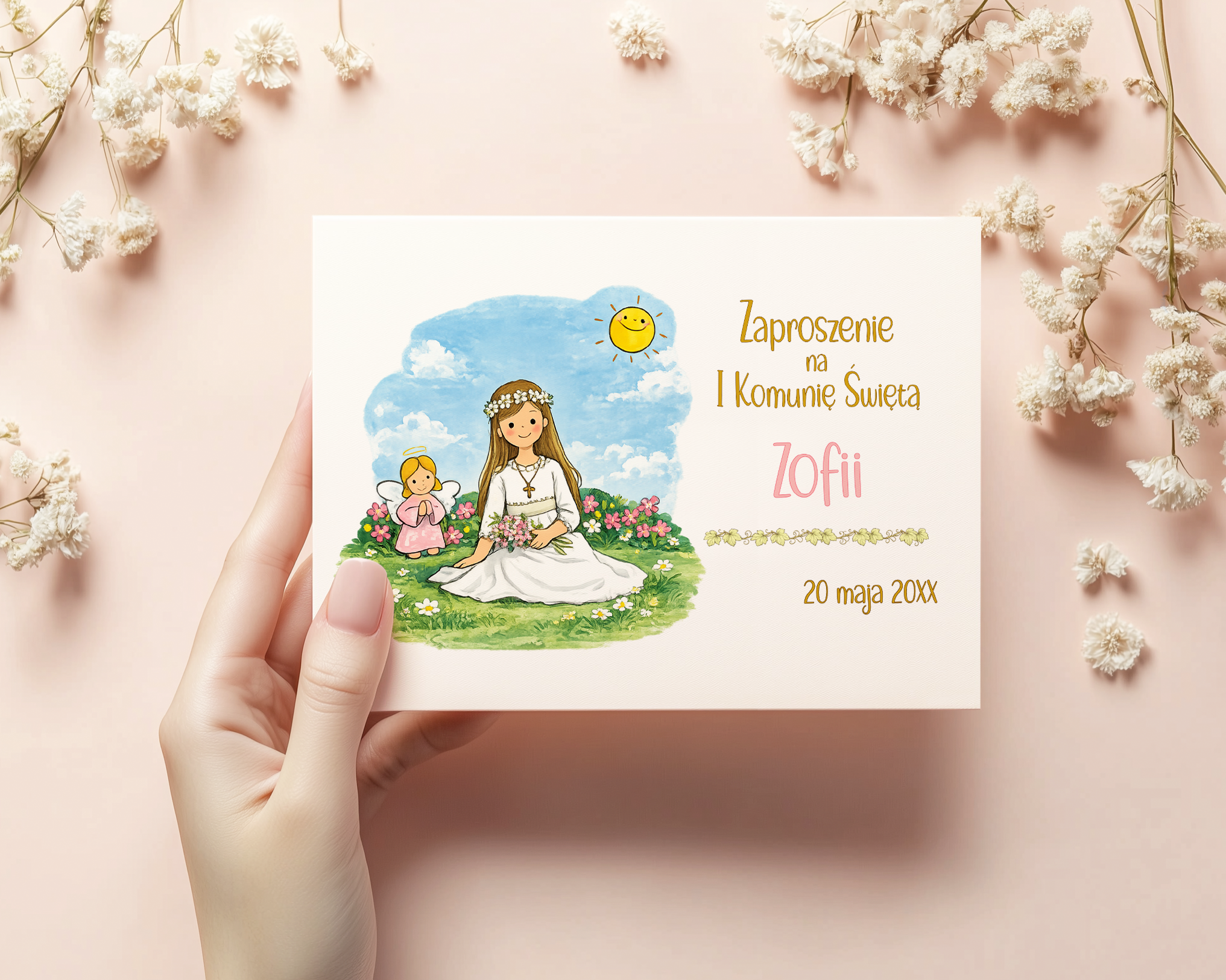 Delikatne zaproszenie na Pierwszą Komunię Świętą z personalizacją. Subtelny, ponadczasowy projekt idealny na wyjątkową uroczystość.