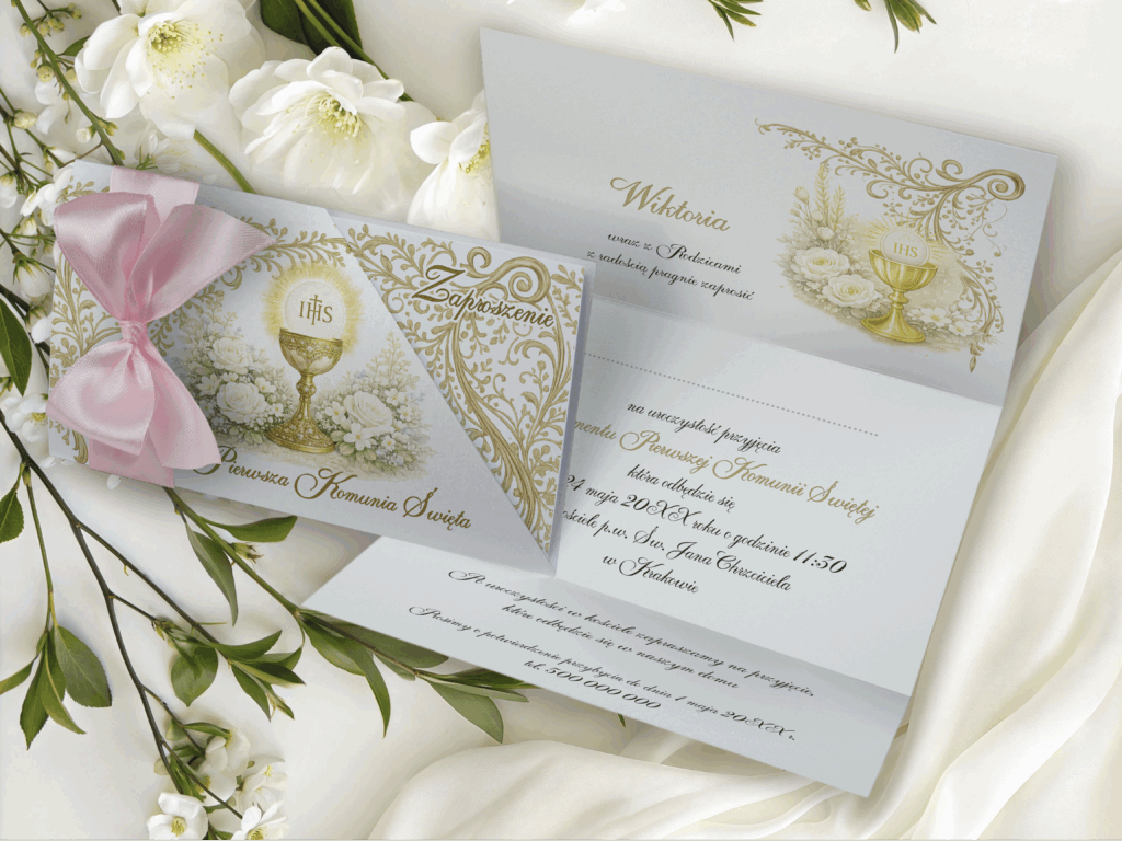 Eleganckie zaproszenie komunijne, idealne na uroczystość Pierwszej Komunii Świętej. Subtelna ilustracja, wysoka jakość papieru i pełna personalizacja sprawiają, że zaproszenie pięknie podkreśla wyjątkowy charakter tego dnia.