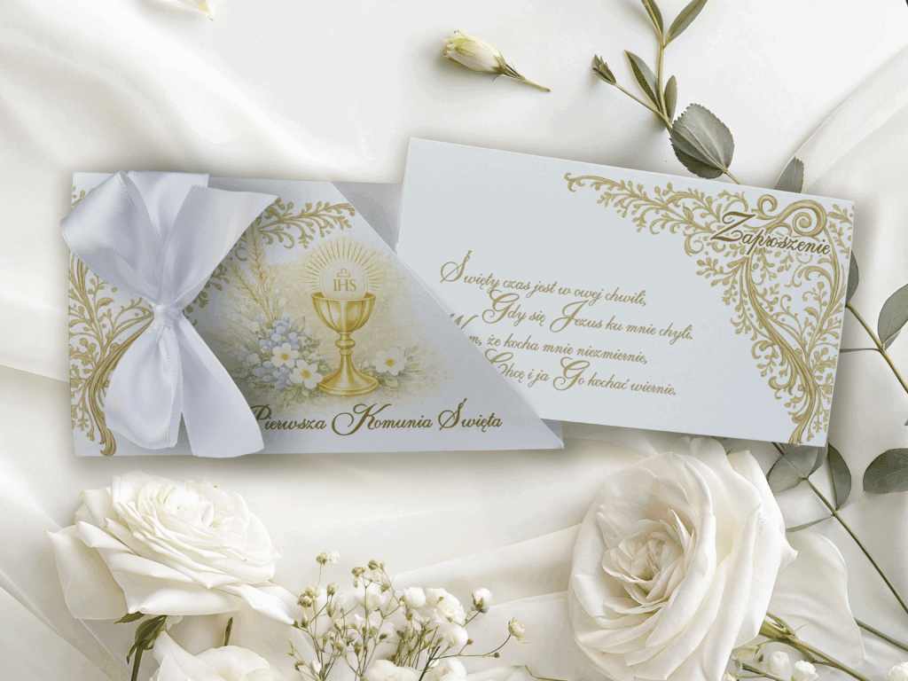 Eleganckie zaproszenie komunijne, idealne na uroczystość Pierwszej Komunii Świętej. Subtelna ilustracja, wysoka jakość papieru i pełna personalizacja sprawiają, że zaproszenie pięknie podkreśla wyjątkowy charakter tego dnia.