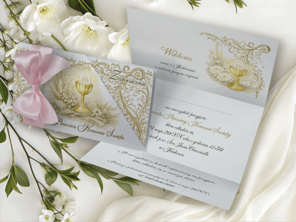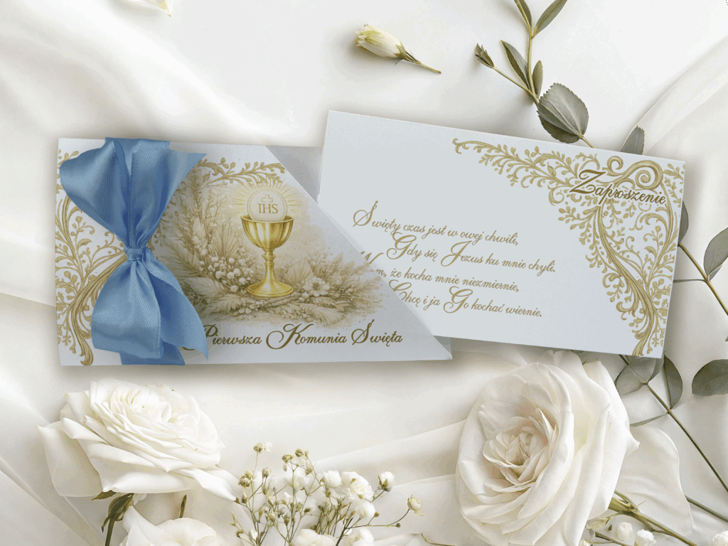 Eleganckie zaproszenie komunijne, idealne na uroczystość Pierwszej Komunii Świętej. Subtelna ilustracja, wysoka jakość papieru i pełna personalizacja sprawiają, że zaproszenie pięknie podkreśla wyjątkowy charakter tego dnia.