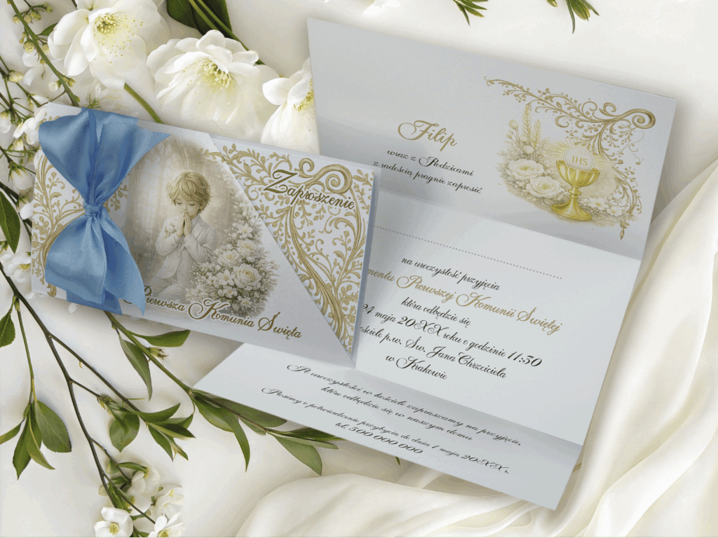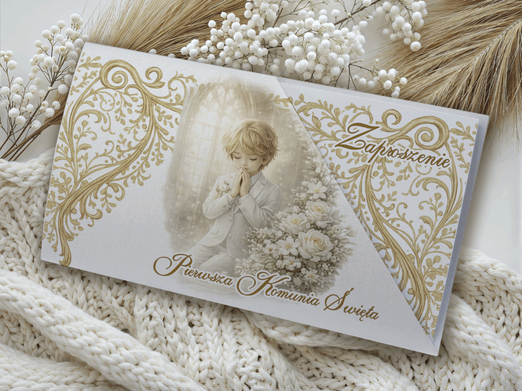 Eleganckie zaproszenie komunijne, idealne na uroczystość Pierwszej Komunii Świętej. Subtelna ilustracja, wysoka jakość papieru i pełna personalizacja sprawiają, że zaproszenie pięknie podkreśla wyjątkowy charakter tego dnia.