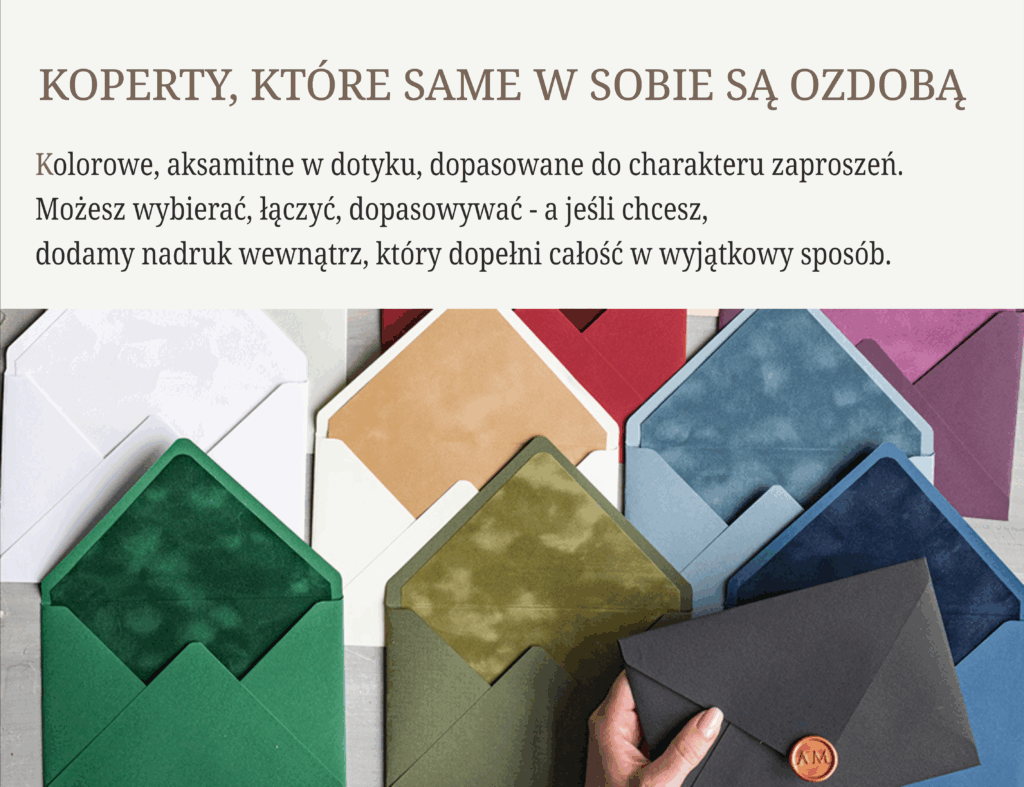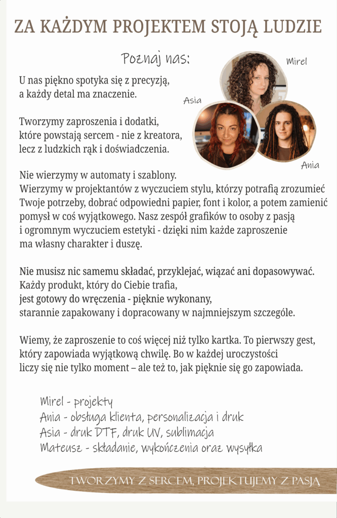 Witaj w miejscu, gdzie piękne detale tworzą wielkie wrażenia. Nasz sklep powstał z miłości do elegancji, estetyki i wyjątkowych chwil. Znajdziesz tu personalizowane zaproszenia, podziękowania dla gości i dodatki okolicznościowe, które zachwycają stylem, jakością i dopracowaniem każdego szczegółu.
